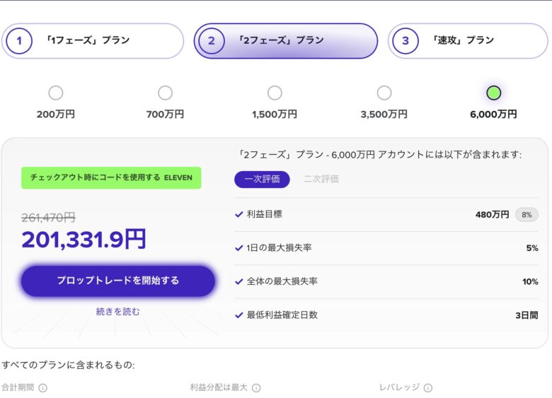 3つのプランの中で2フェーズプランが最もおすすめです。理由は「利益分配率が高い」「絶対ドローダウン方式で有利」「参加費返金制度がある」からです。コスパ的には3,500万円口座や6,000万円口座が良いですが、初めての方は200万円〜500万円で試してみることをおすすめします。