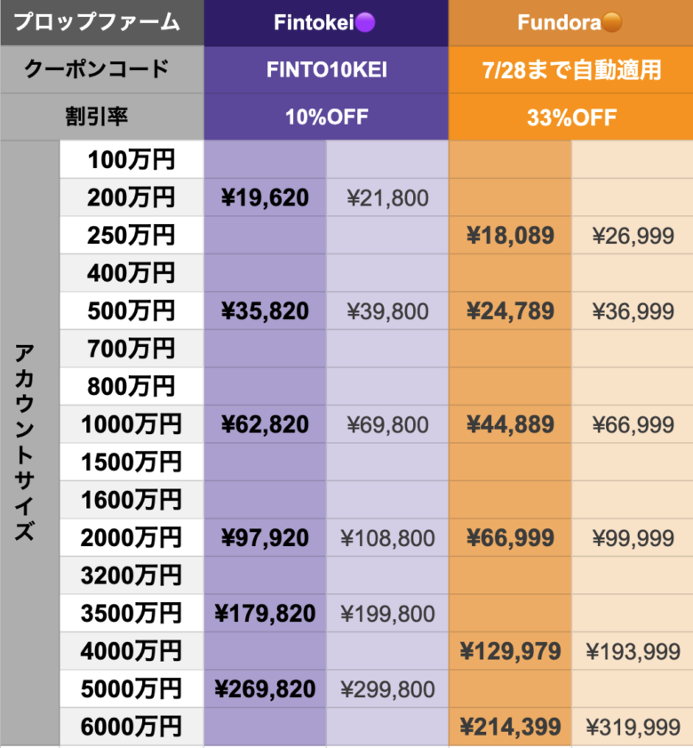 気になるFintokeiとの価格を比較してみた結果、どの初期資本額のサイズでもFundora🟠がFintokei🟣よりも安いことがわかりました。