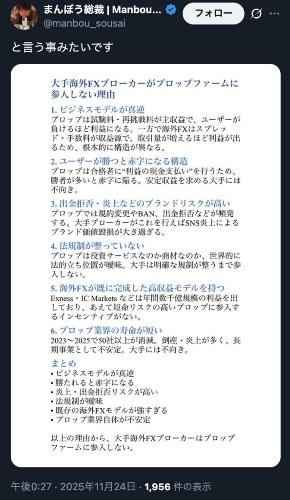 先日、海外FXの情報発信で知られるまんぼう総裁氏(@manbou_sousai)が「大手海外FXブローカーがプロップに参入しない理由」としてX上で発信した内容が話題になりました。